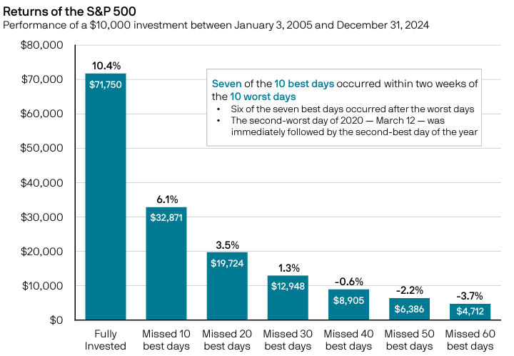 When the market drops, it’s tempting to sell and wait for calmer days. But that can backfire. If you sell during a dip, you “lock in your loss”—meaning you lose that money for good unless you buy back in at the perfect moment. And timing the market is tough because the best days often come right after the worst ones. Since 1990, missing just the best day each year would’ve cut your return from 7.7% to 3.9%. Miss the best two days a year, and you’re barely up 1%. Miss the top 20 days, and you’d lose 27% a year! Staying invested keeps you in the game for those big recovery days.